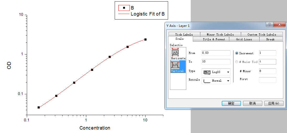 在雙對數(shù)方格紙上繪制四參數(shù)邏輯曲線,x 軸為標準濃度,y 軸為 OD 值。推薦使用Origin軟件。如果需要了解Origin軟件可以參考(http://www.originsoft.cn/)。