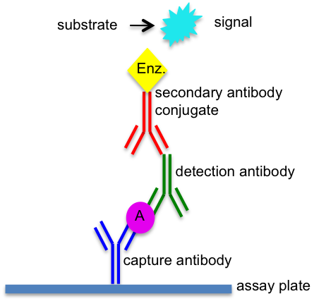 夾心ELISA需要使用兩對抗體,分別識別抗原的不同表位,而且這兩個表位不能重疊。首先,將捕獲抗體固定在反應板的孔中。然后,加入待測樣本,如果樣本中含有待測抗原,抗原就會與捕獲抗體結(jié)合。接著,加入酶標記的檢測抗體,它能夠識別與捕獲抗體結(jié)合的抗原。最后,加入底物溶液,酶催化底物發(fā)生顏色變化,顏色變化的程度與樣本中抗原的含量成正比。