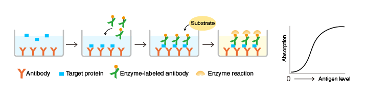 接下來(lái),添加一種抗體(稱(chēng)為第二抗體),該抗體可識(shí)別與抗原捕獲抗體所識(shí)別的表位不同的表位。我會(huì)把它留一會(huì)兒。該第二抗體預(yù)先與酶化學(xué)結(jié)合。添加的酶標(biāo)記第二抗體識(shí)別并結(jié)合與捕獲抗體結(jié)合的抗原。然后,洗去多余的酶標(biāo)二抗。接下來(lái),添加酶的顯色底物溶液以允許酶反應(yīng)發(fā)生。顯色底物通過(guò)酶的作用轉(zhuǎn)化為色素。因此,通過(guò)添加反應(yīng)終止液來(lái)終止酶反應(yīng)后,使用96孔微孔板比色計(jì)測(cè)量染料的顯色。這樣,可以將與捕獲抗體結(jié)合的抗原的量作為染料進(jìn)行測(cè)量。比色測(cè)定的結(jié)果以吸光度表示,因此以標(biāo)準(zhǔn)品的測(cè)定結(jié)果為橫軸,以抗原濃度,縱軸為吸光度,繪制校準(zhǔn)曲線(xiàn),計(jì)算出樣品中抗原的量由此。圖中所示的ELISA實(shí)現(xiàn)方法是最簡(jiǎn)單的方法。由于酶的分子量相當(dāng)大,使用該方法時(shí),用酶標(biāo)記抗體可能會(huì)對(duì)抗體的結(jié)合能力造成空間阻礙。