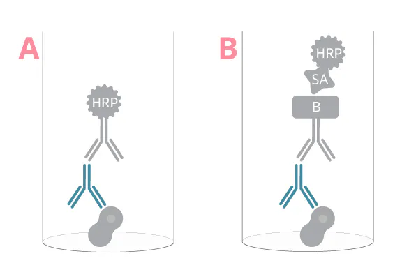 典型的夾心測定設(shè)置可用于檢測相同同種型(也稱為類)或相同抗體亞類的抗體(圖 1C、圖 3)。為此,您需要一對(duì)特異于 Ig Fc 部分(抗體骨架)的匹配抗體對(duì),以區(qū)分同種型或亞類。將捕獲抗體包被到 ELISA 板后,樣品中的 Ig 將被特定包被 mAb 捕獲,然后在下一步中被檢測抗體夾在中間。由于 Ig 同種型通常在血液樣本中含量豐富,因此一步檢測設(shè)置(圖 3A)可能優(yōu)于兩步檢測(圖 3B),因?yàn)椴恍枰盘?hào)放大。IgE 是一個(gè)例外,由于其在人體中的豐度較低,因此應(yīng)使用兩步 ELISA 進(jìn)行分析。