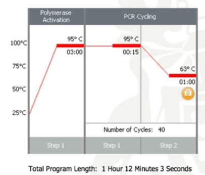 PCR 三個(gè)主要步驟的流程圖,包括 PCR 溫度循環(huán)、循環(huán)次數(shù)和總程序長(zhǎng)度
