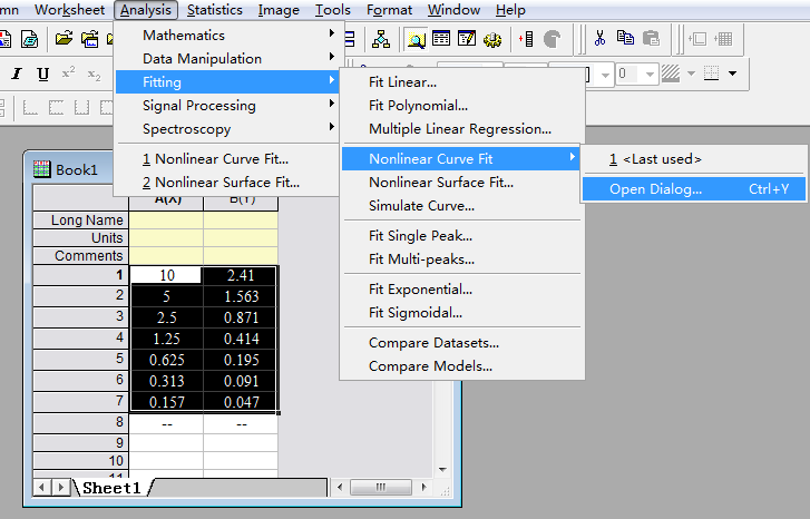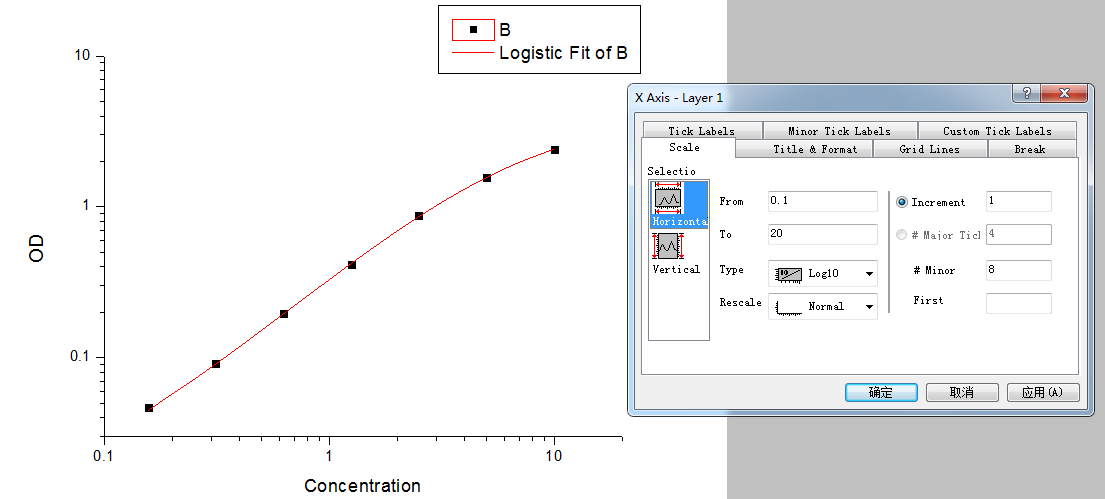 在雙對數(shù)方格紙上繪制四參數(shù)邏輯曲線,x 軸為標準濃度,y 軸為 OD 值。推薦使用Origin軟件。如果需要了解Origin軟件可以參考(http://www.originsoft.cn/)。