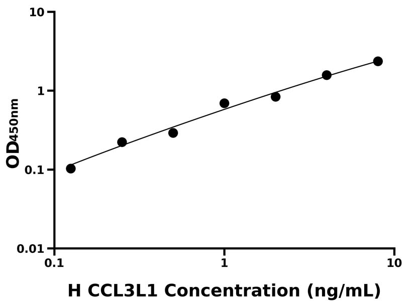 本試劑盒采用雙抗體夾心法ELISA技術(shù) : 將捕獲抗體包被于酶標(biāo)板上,捕獲樣品及標(biāo)準(zhǔn)品中的待測物CCL3L1,清洗后,再加入生物素標(biāo)記的檢測抗體進(jìn)行孵育后清洗,形成“捕獲抗體-抗原-檢測抗體”免疫復(fù)合物,隨后加入鏈霉親和素偶聯(lián)的辣根過氧化物酶進(jìn)行孵育,待孵育結(jié)束后清洗,接著加入TMB顯色后,若樣本中有待測物則顯藍(lán)色,加入終止液停止反應(yīng)。檢測過程中游離的成分均被洗去,用酶標(biāo)儀在450 nm處測OD值,顏色的深淺和樣品中的待測物的含量呈正比,通過繪制標(biāo)準(zhǔn)曲線計(jì)算出樣本中CCL3L1的濃度。