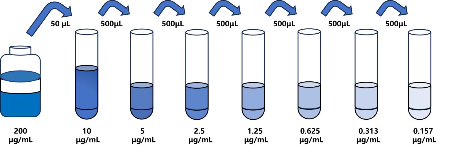 試劑盒中取出標準品,準備7個試管,先從200.0μg/mL標準品(200μL)按需吸取一定量用1×稀釋液稀釋至10μg/mL(例:50μL的標準品母液+950μL的1×稀釋液,制備得到1000μL的10μg/mL濃度標準品),隨后在6個試管中分別加入500μL的1×稀釋液,在這6個單獨的試管中將10μg/mL標準品依次2倍倍比稀釋至6個梯度,共配制7個濃度的標準品,依次為:10μg/mL、5μg/mL、2.5μg/mL、1.25μg/mL、0.625μg/mL、0.313μg/mL、0.157μg/mL,從最高濃度標準品溶液中吸取500μL標準品到下一個試管中,輕輕吹打混勻,以此類推進行標準品的倍比稀釋(如圖所示),1×稀釋液用作零濃度標準品(0μg/mL)。